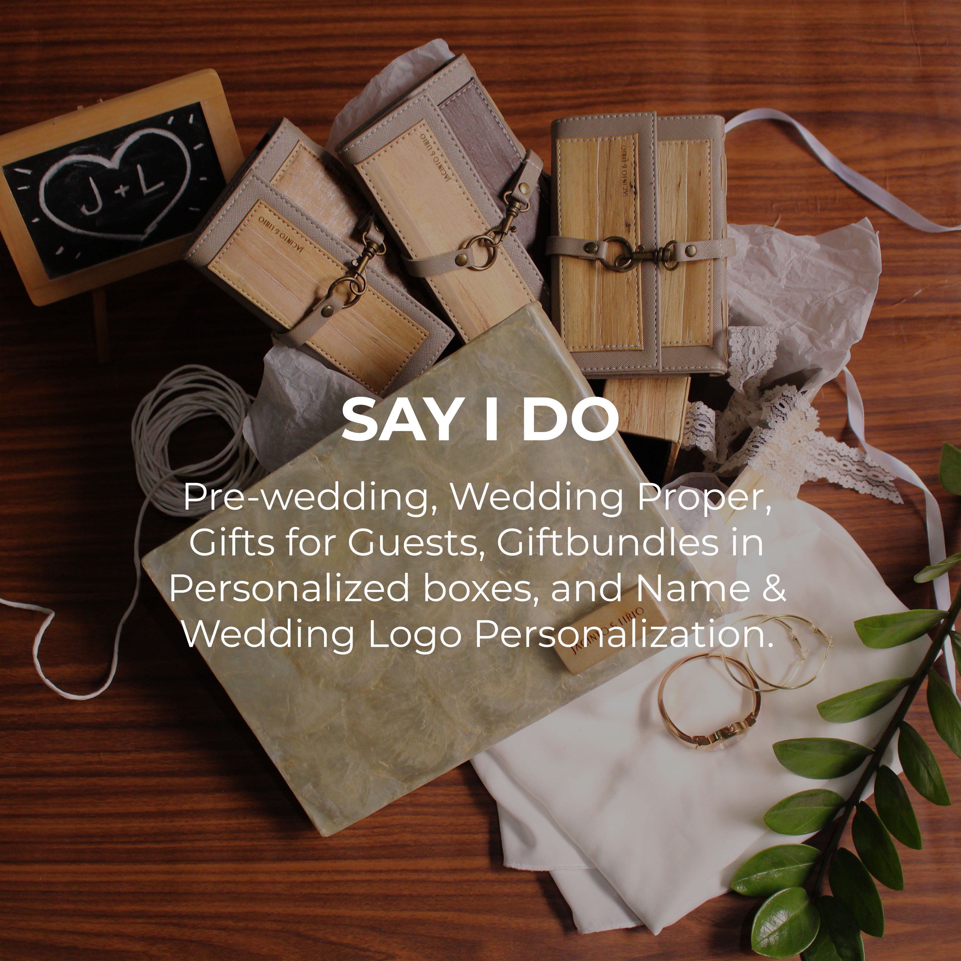 Say I DoPre-wedding, wedding proper, gifts for guests, gift bundles in personalized boxes and name & wedding logo personalization.