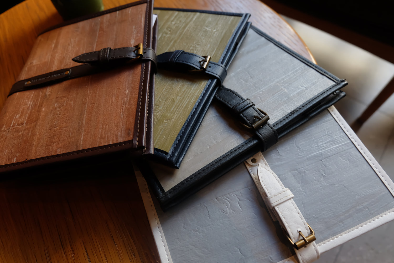 We use plant leather for the covers. No animal was harmed in the process of manufacturing our products. Our wallet organizer uses sustainably harvested vegan leather that helps in lessening the water hyacinths that are polluting bodies of water in different local communities.