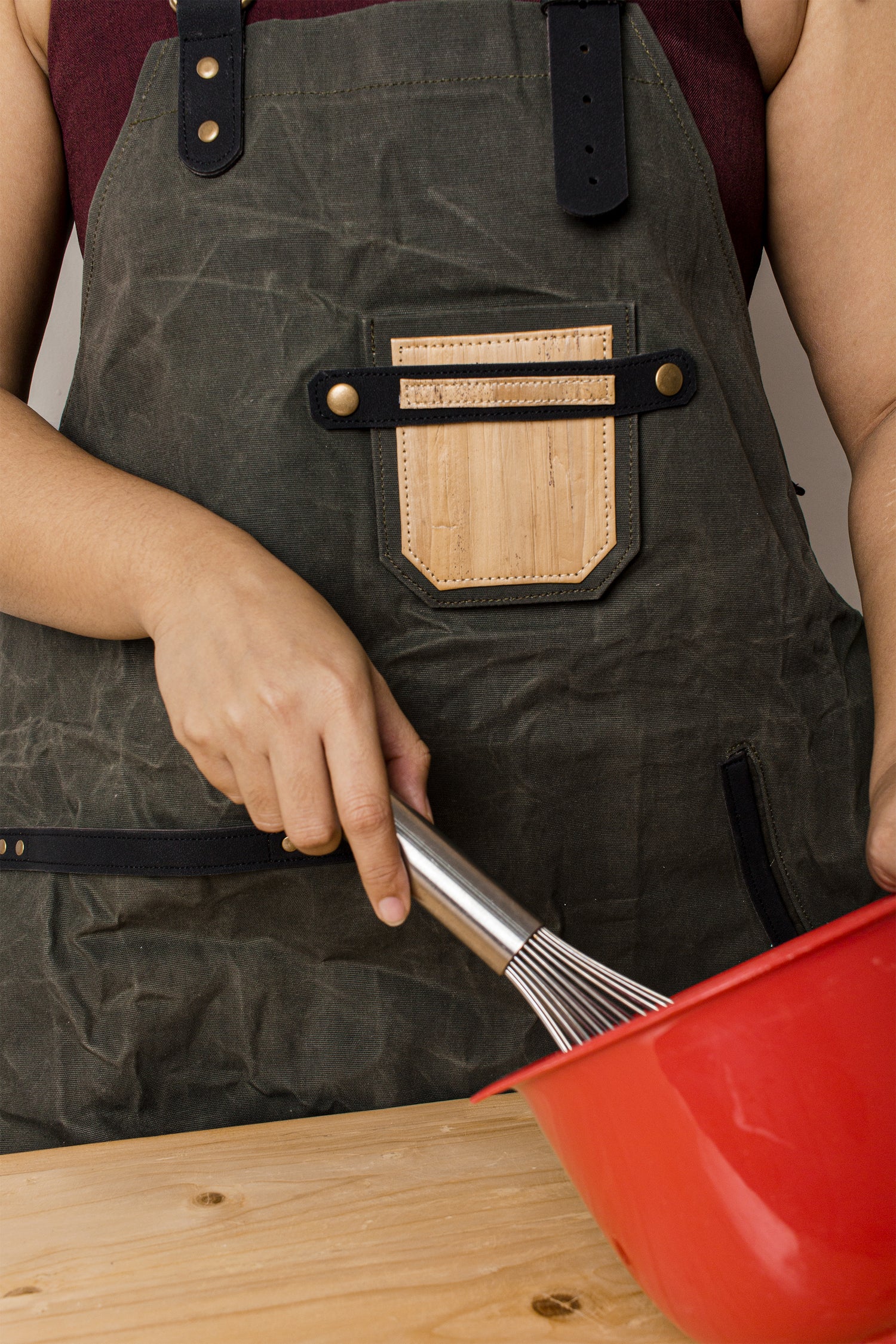 Akap Artisan Vegan Leather Family Matching Apron w/ Adjustable Cross-back Straps & Chest Pockets and Bigkis Water Resistant Waxed Canvas Vegan Leather Family Matching Apron w/ Adjustable Neck Strap, Chest Pockets & Pen Holder
