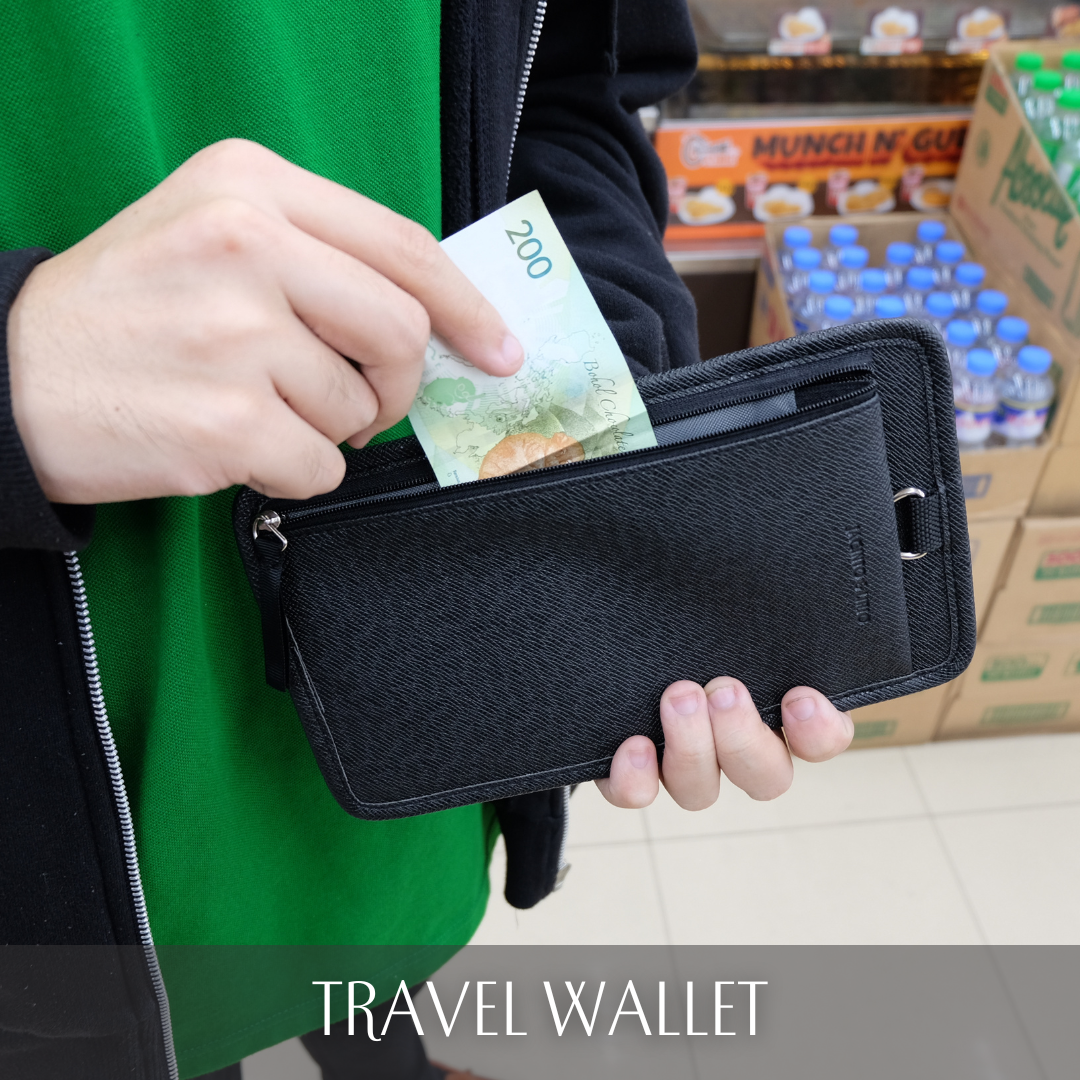 Truly an essential when traveling, this travel essentials kit is the answer to being able to carry your passport, boarding pass, cell phone and money in one hand while carrying your luggage in another.