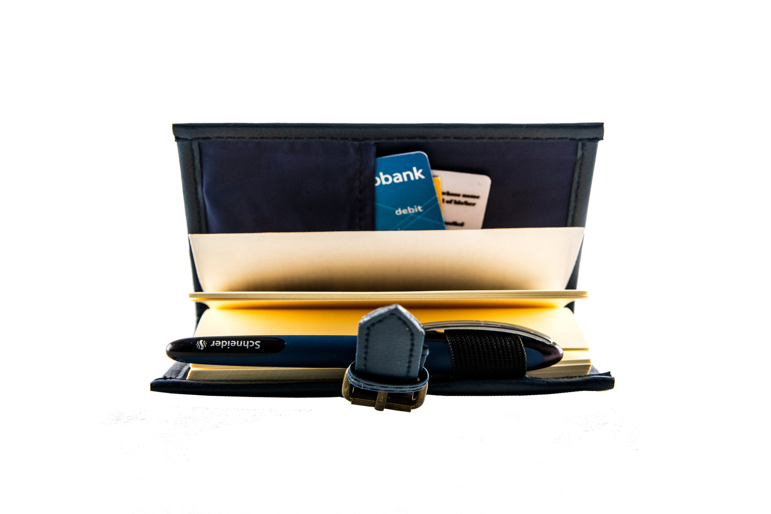No matter what size, your pen will be securely fastened. A pen-holder on the side makes you ever-ready whenever you need to sign that all important travel paper or write down that number.