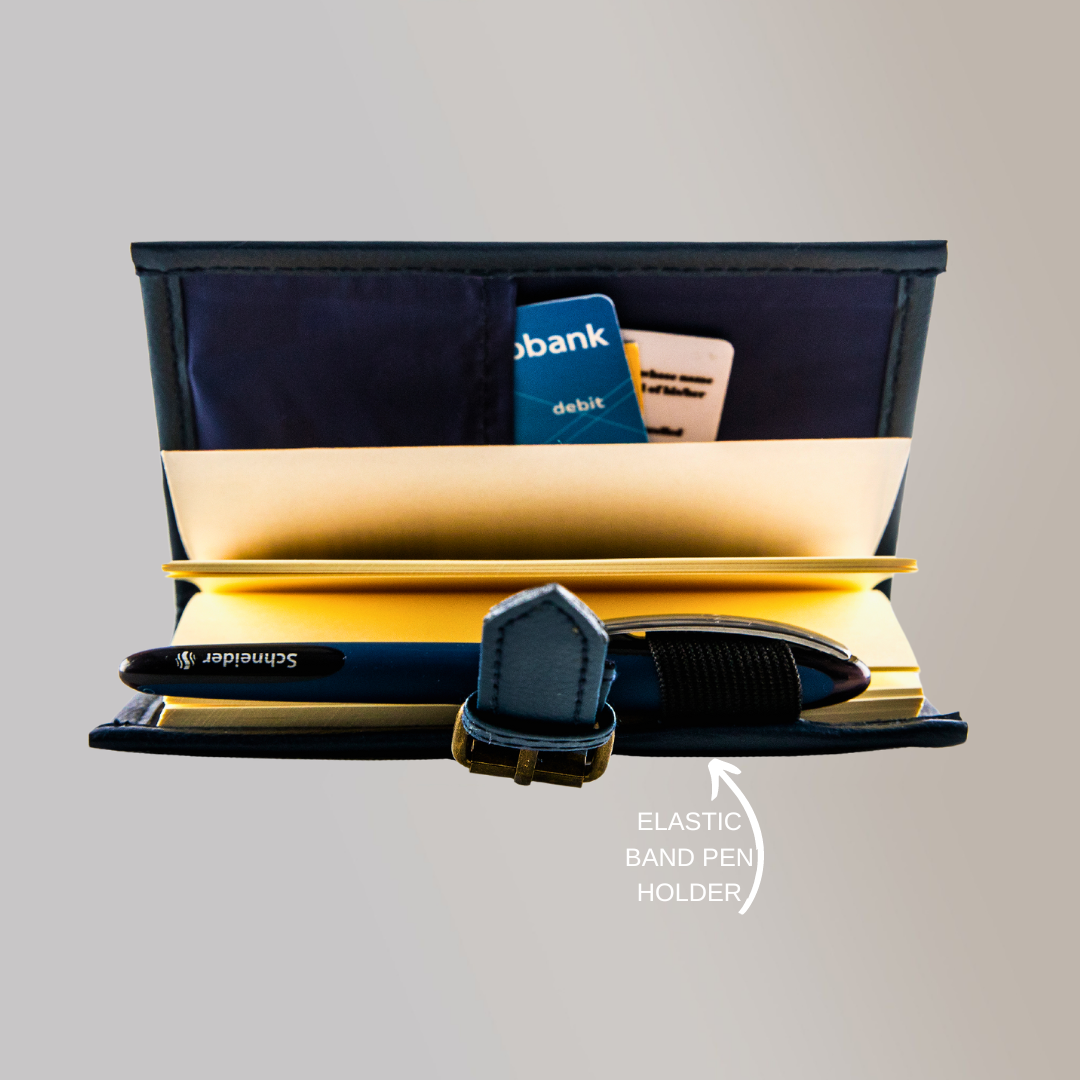 No matter what size, your pen will be securely fastened. A pen-holder on the side makes you ever-ready whenever you need to sign that all-important travel paper or write down that number.