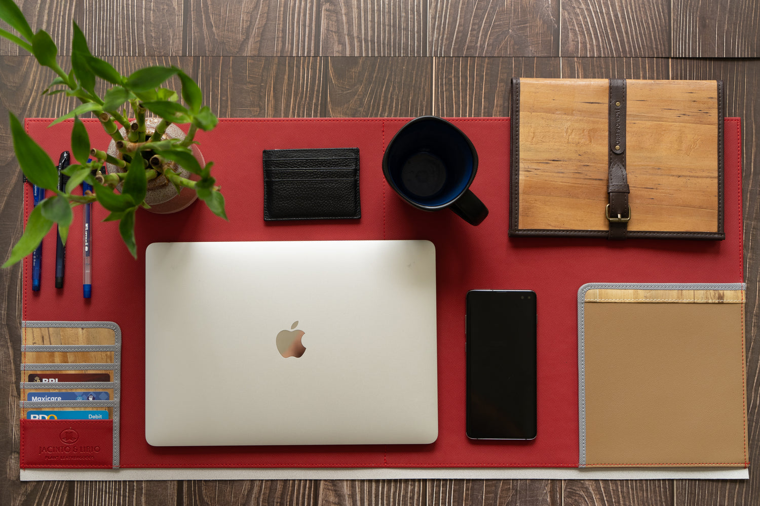 We can curate a mix of our handmade water hyacinth vegan leather-goods with non-water hyacinth items to combine into your preferred stylized gift set personalized with both name and logo.